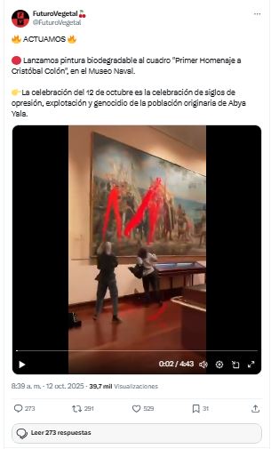 Activistas del colectivo ambientalista Futuro Vegetal lanzaron pintura roja «biodegradable» a un cuadro de Cristóbal Colón en el Museo Naval de Madrid (España) como protesta contra «siglos de opresión a la población indígena» en América.
