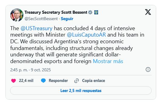 “Argentina enfrenta un momento de aguda falta de liquidez. La comunidad internacional, incluyendo el FMI, está unida detrás de Argentina y su prudente estrategia fiscal, pero solo Estados Unidos puede actuar rápidamente. Y actuaremos”, indicó Bessent en X, tras cuatro días de negociaciones con su homólogo argentino, Luis Caputo.