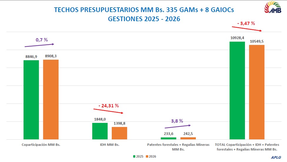 De acuerdo a los techos presupuestarios que dispuso el Ministerio de Economía para la siguiente gestión alcanzará a Bs 10.549,5 millones, de los cuales Bs 8.908,3 millones son recursos de la coparticipación tributaria, Bs 1.398,8 millones del IDH y Bs 242,5 millones por patentes forestales y regalías mineras.