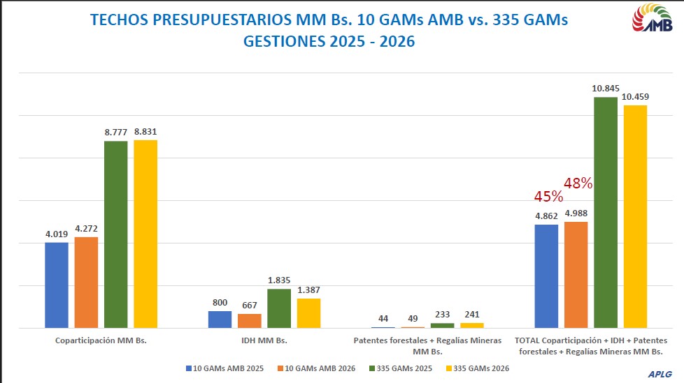 Con relación a las ciudades capitales y El Alto, Lema detalló que para la siguiente gestión se dispuso un techo presupuestario de Bs 4.988 millones. De ese monto, Bs 4.272 millones son por la coparticipación tributaria, Bs 667 millones del IDH y Bs 49 millones por recaudaciones propias.