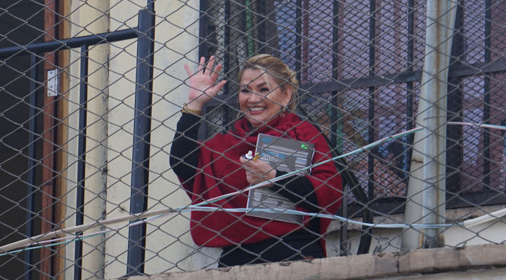 Fotografía de archivo de Áñez mientras saluda desde uno de los balcones del Centro de Orientación Femenina de Miraflores, en La Paz. Foto: EFE