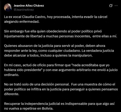 «La exvocal Claudia Castro, hoy procesada, intenta evadir la cárcel alegando enfermedad. Sin embargo fue ella quien obedeciendo al poder político privó injustamente de libertad a muchas personas inocentes, entre ellas a mí», aseguró Añez a través de sus redes sociales.