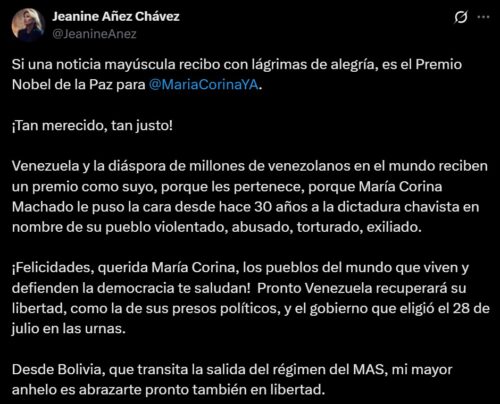 Luego de confirmarse el Nobel de la Paz para la líder venezolana María Corina Machado, la expresidenta Jeanine Añez le expresó su felicitación y afirmó que anhela pronto abrazarla en libertad.