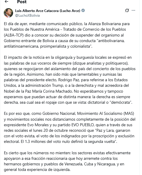 En un mensaje en X publicado anoche, Arce se refirió a la decisión de la Alianza Bolivariana para los Pueblos de Nuestra América (ALBA) de suspender la permanencia de Bolivia una vez que asuma Paz, y cuestionó con dureza a Morales.