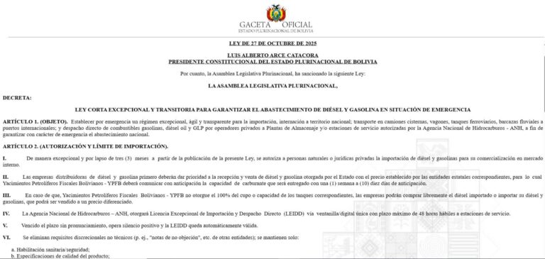 … Sigue leyendo Arce promulga la “Ley Corta” para garantizar el abastecimiento de combustible y advierte sobre el impacto de la libre importación