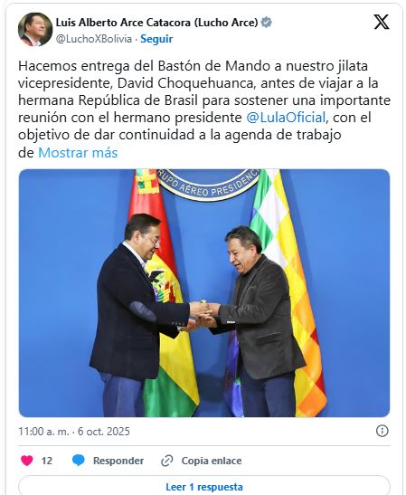 “Hacemos entrega del Bastón de Mando a nuestro jilata (hermano) vicepresidente, David Choquehuanca, antes de viajar a la hermana República de Brasil para sostener una importante reunión con el hermano presidente @LulaOficial”, escribió Arce.