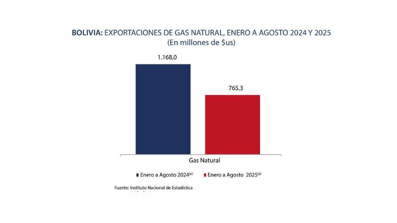 La cifra implica un 34,5% menos si se toma en cuenta que entre enero y agosto de 2025 se exportó el hidrocarburo logrando ingresar $us 765,3 millones, cifra que está por debajo de los $us 1.168 millones registrados en el mismo lapso de tiempo de 2024.