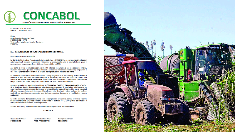 “A la fecha, la deuda acumulada supera los Bs. 300 millones, con una mora que sobrepasa los 60 días, situación inaceptable que está llevando al sector a una asfixia económica insostenible y empujando a una crisis a quienes representamos el 60,60% de la producción nacional de etanol”, reza el reclamo que está dirigido al presidente de YPFB, Armin Dorgathen.