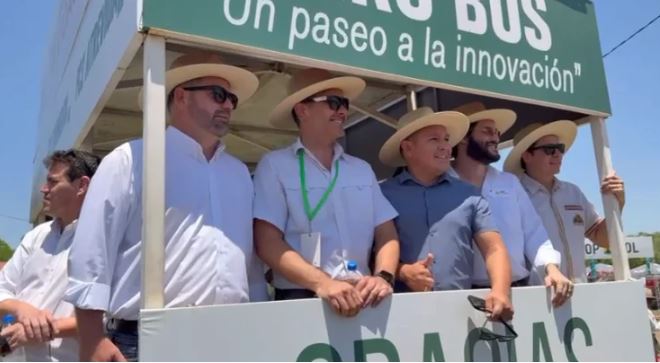 El presidente de la CAO junto a otros visitantes en la feria Agro Vidas en Santa Cruz. Foto captura de video