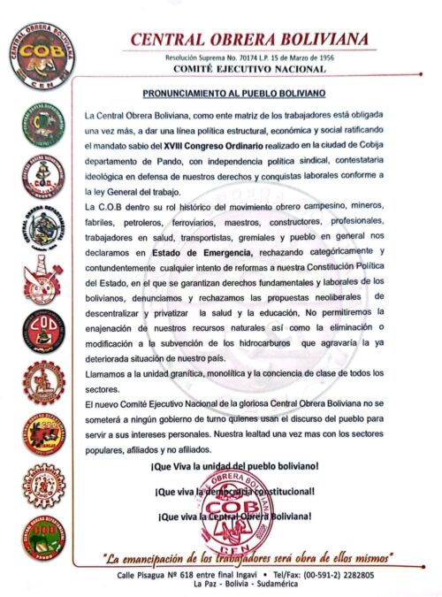 “En la COB nos declaramos en estado de emergencia, rechazando categóricamente y contundentemente cualquier intento de reformas a nuestra Constitución Política del Estado, en el que se garantizan derechos fundamentales y laborales de los bolivianos, denunciamos y rechazamos las propuestas neoliberales de descentralizar y privatizar la salud y la educación, No permitiremos el enajenamiento de nuestros recursos naturales como el litio asimismo la modificación a la subvención de los hidrocarburos que agravaría ya la crisis económica que atravesamos los trabajadores del país», señala el pronunciamiento emitido.