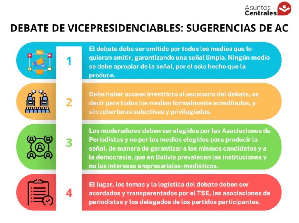 3.-Los moderadores deben ser elegidos por las Asociaciones de Periodistas y no por los medios elegidos para producir la señal, de manera de garantizar a los mismos candidatos y a la democracia, que en Bolivia prevalecen las instituciones y no los intereses empresariales-mediáticos.