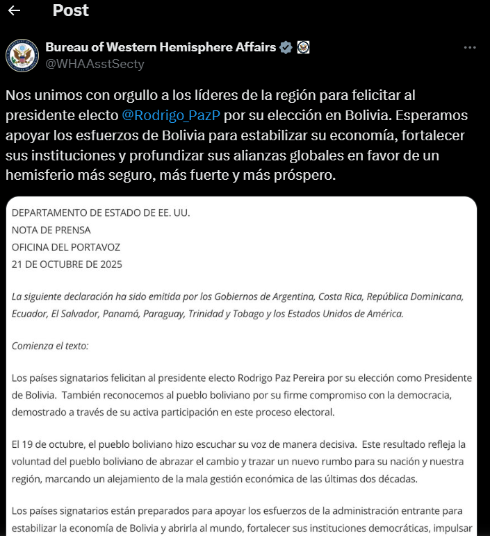 “Nos unimos con orgullo a los líderes de la región para felicitar al presidente electo Rodrigo Paz por su elección en Bolivia”, señala una parte de la publicación compartida en las redes sociales por la Oficina de Asuntos del Hemisferio Occidental de Estados Unidos.