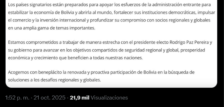 El documento agrega que los nueve gobiernos están preparados para apoyar los esfuerzos que encare el gobierno de Paz “para estabilizar la economía de Bolivia y abrirla al mundo, fortalecer sus instituciones democráticas, impulsar el comercio y la inversión internacional, y profundizar su compromiso con socios regionales y globales en una amplia gama de temas importantes”.