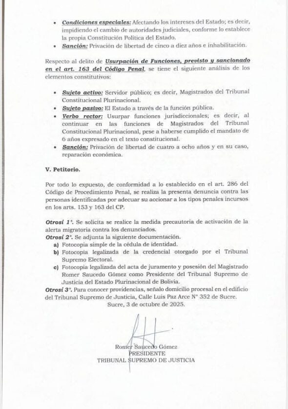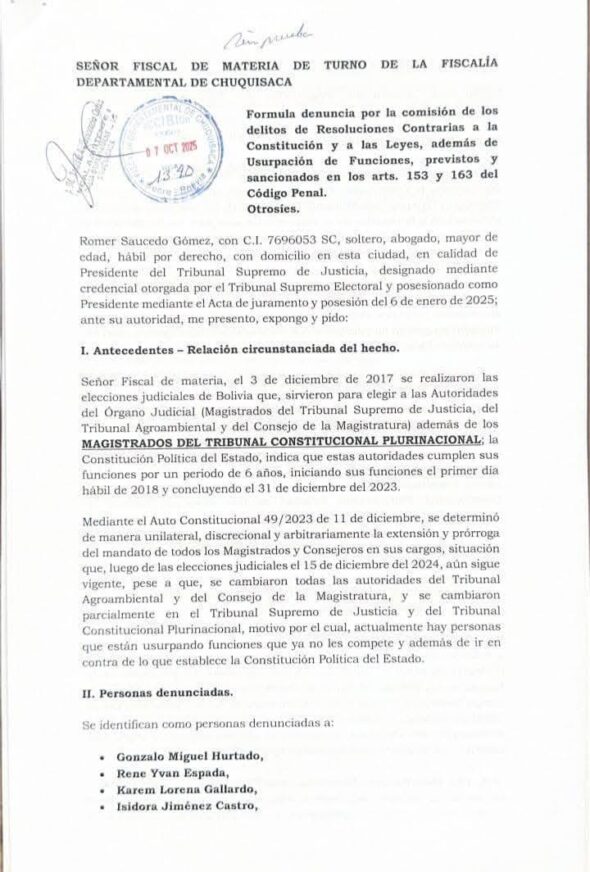 Inicia la batalla por la institucionalidad de la justicia. En un hecho sin precedentes, el presidente del Tribunal Supremo de Justicia (TSJ), Romer Saucedo, interpuso una denuncia penal contra cinco magistrados del Tribunal Constitucional Plurinacional (TCP) por los delitos de resoluciones contrarias a la constitución y a las leyes y usurpación de funciones. La denuncia, presentada el 7 de octubre de 2025 ante la Fiscalía Departamental de Chuquisaca, señala como imputados a Gonzalo Miguel Hurtado, Rene Yvan Espada, Karem Lorena Gallardo, Isidora Jiménez Castro y Julia Elizabeth Cornejo.