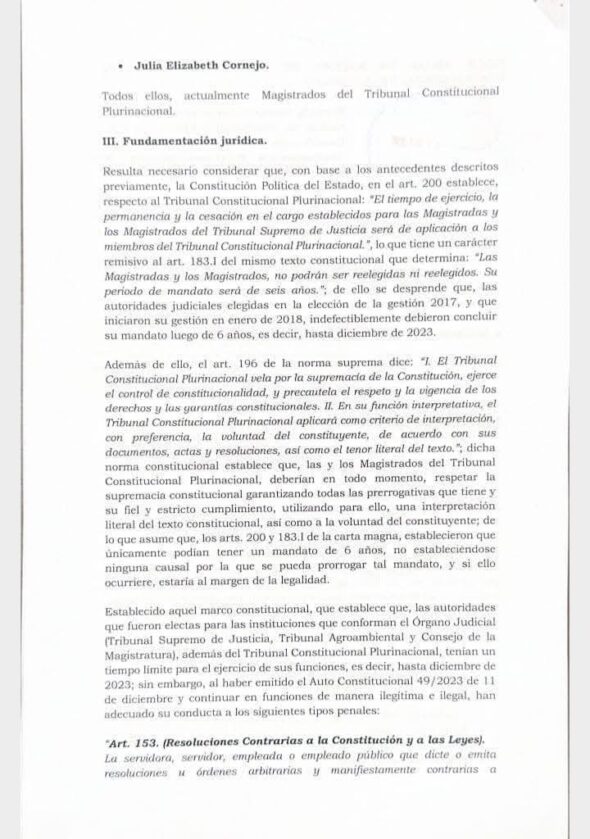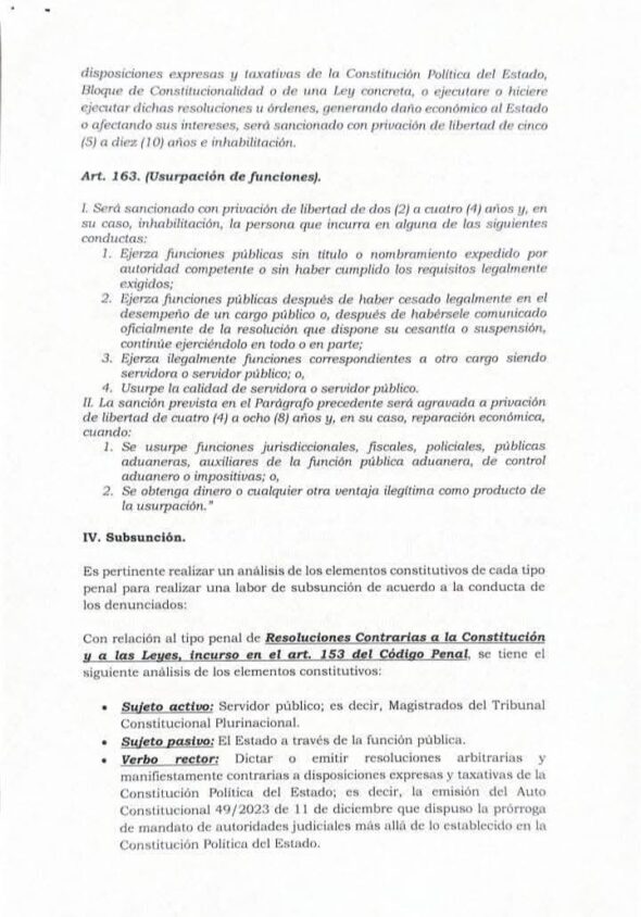 Respecto al delito de Resoluciones Contrarias a la Constitución (artículo 153 del Código Penal), la denuncia detalla que los magistrados incurrieron en este tipo penal al «dictar o emitir resoluciones arbitrarias y manifiestamente contrarias a disposiciones expresas y taxativas de la Constitución Política del Estado», específicamente mediante el Auto Constitucional 49/2023.