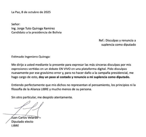 El diputado electo Juan Carlos Velarde presentó este miércoles al candidato Jorge Tuto Quiroga su renuncia al cargo de legislador suplente que había obtenido con Alianza Libre, luego de los dichos racistas y discriminatorios que pronunció en una transmisión en línea.