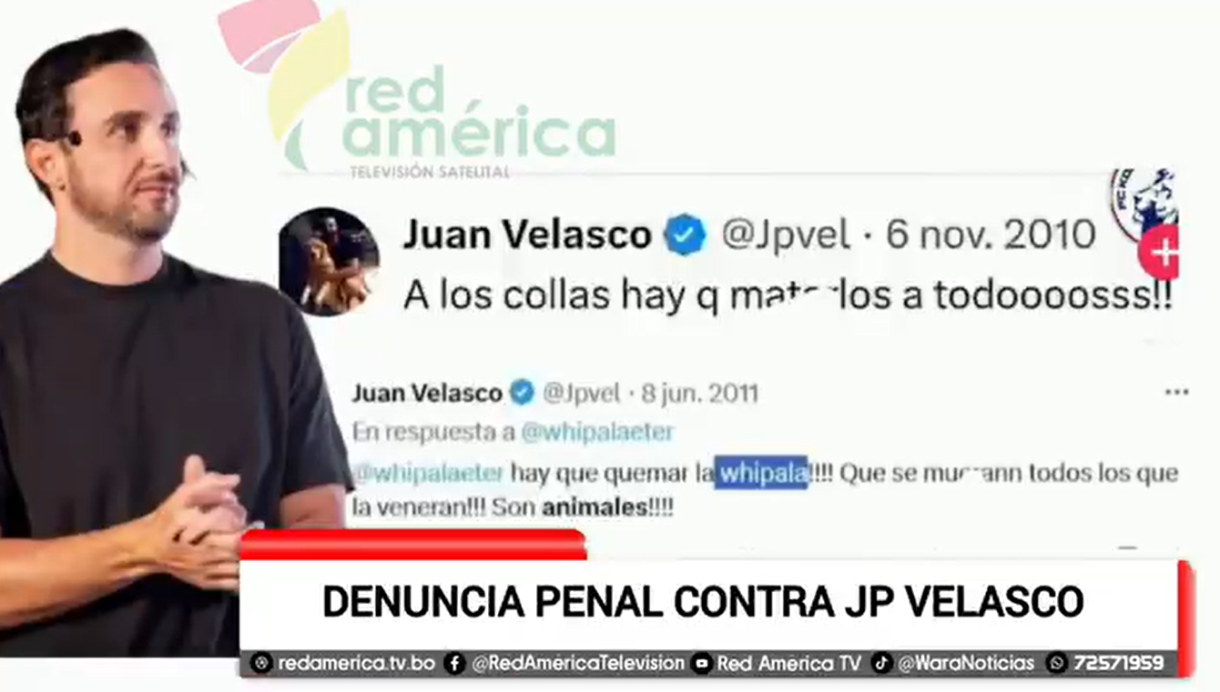 Se trata de supuestos mensajes de larga data, que habrían sido subidos por JP Velasco en la entonces red social Twitter, específicamente, entre 2010 y 2012. En noviembre de 2010 se muestra un texto que señala: “A los collas hay q matarlos a todos (Sic)”; en 2011: “Hay que quemar la whipala, que se mueran todos los que la veneran, son animales”; y en agosto de 2012: “No todos los bolivianos somos collas”. La veracidad de los posts fue corroborada por el análisis de las verificadoras Chequea Bolivia y Bolivia Verifica.