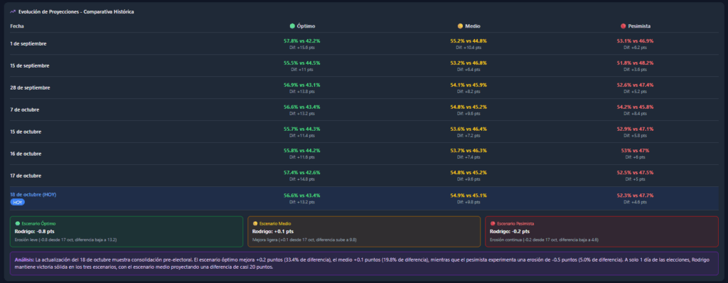 - La proyección del 18 de octubre fue EXACTA:9% vs 45.1%