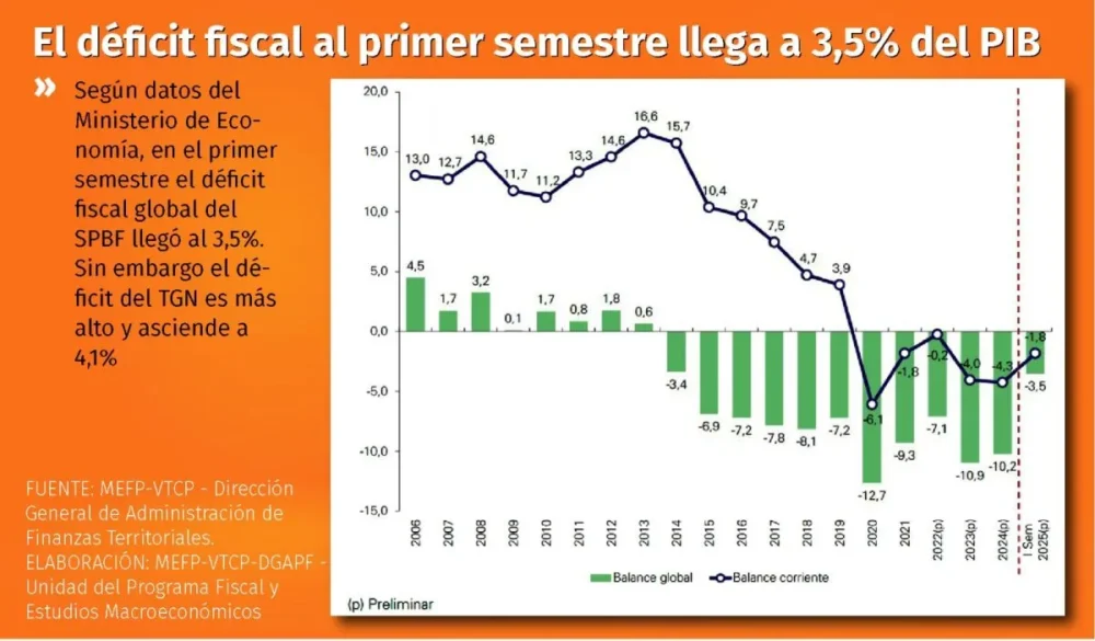“El déficit fiscal global se amplió pese al dinamismo de las empresas estatales. El SPNF registró un déficit global equivalente al 3,5% del PIB al cierre del primer semestre de 2025 explicado principalmente por la continuidad de políticas orientadas a proteger el poder adquisitivo de la población mediante subvenciones a hidrocarburos y alimentos, junto con el pago de intereses de la deuda”, señala esa cartera de Estado, en un informe reciente al que accedió Visión 360.