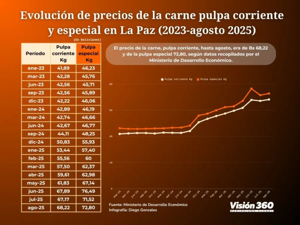 De acuerdo con un reporte de precios al consumidor final del Ministerio de Desarrollo Productivo, en agosto, la carne, corte pulpa corriente costaba 68,22 bolivianos el kilo, cuando en diciembre de 2024 solo era de 50,83 bolivianos y enero de 2023 tenía un costo de 46,23 bolivianos.