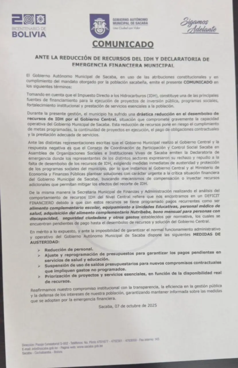 El Gobierno Autónomo Municipal de Sacaba declaró emergencia financiera tras una drástica reducción en el desembolso de recursos del Impuesto Directo a los Hidrocarburos (IDH) por parte del Gobierno Central, situación que, según el comunicado oficial, compromete gravemente la capacidad operativa de la institución.