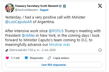 De esta manera, el secretario del Tesoro continuó con su estrategia de tuitear a favor del Gobierno de Milei como un intento de tranquilizar a los mercados, y que inició la semana pasada, cuando anunció que EE.UU. rescataría financieramente al país sudamericano.