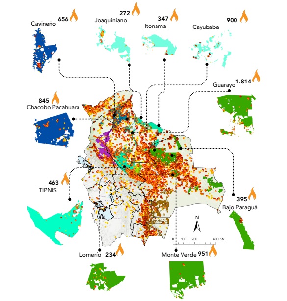 Los reportes satelitales indican de 8.077 focos de calor ocurridos en 48 de los 58 territorios indígenas que existen en las regiones del Oriente, Chaco y Amazonía, entre el 29 de septiembre y el 16 de octubre. La Chiquitanía sigue siendo la región más afectada, además del territorio Guarayo y Monte Verde.