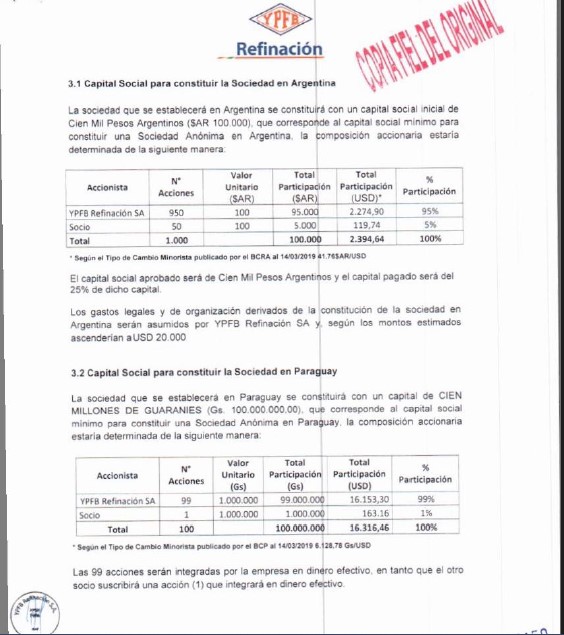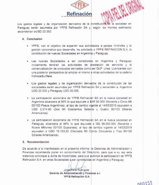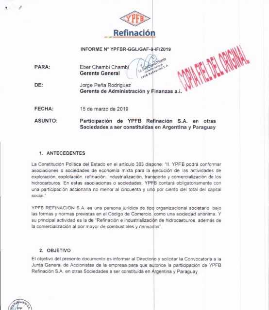 De acuerdo a los documentos a los que accedió este medio, en el informe YPFBR – GGL/GAF – 9 – IF/2019 del 15 de marzo de 2019, de YPFB Refinación, se recomendó conformar nuevas sociedades en Argentina y Paraguay con el objetivo de expandir las actividades de exploración, explotación, comercialización de hidrocarburos fuera del Estado boliviano.