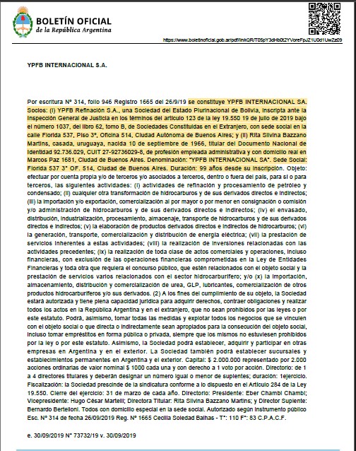 “Por escritura Nº 314, folio 946 registro 1665 del 29/9/19 se constituye YPFB INTERNACIONAL S.A. Socios: YPFB Refinación una sociedad del Estado Plurinacional de Bolivia inscrita ante la Inspección General de Justicia (…) y Rita Silvina Bazzano Martins, casada, uruguaya, nacida el 10 de septiembre de 1966”, dice el registro.
