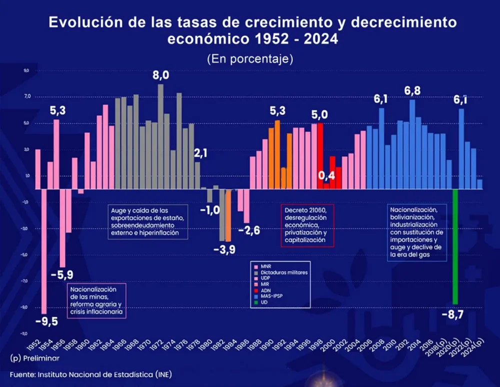 El pasado martes el Instituto Nacional de Estadísticas (INE) reportó que la economía boliviana se contrajo en -2,40%. Pero en los últimos 75 años, el país enfrentó nueve gestiones o períodos de recesión económica que trajeron sufrimiento y pobreza a las familias bolivianas. Salir de esas crisis demoró años y provocó desempleo, caída de ingresos y ajuste de los cinturones.