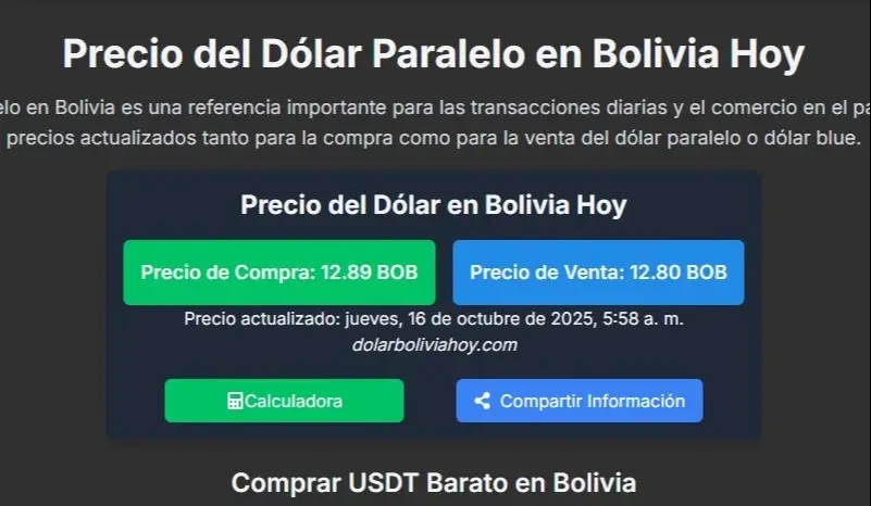 Según datos emitidos este jueves 16 de octubre de 2025, por el portal especializado dolarboliviahoy.com, la divisa estadounidense se cotiza en el mercado paralelo con un precio a la venta de 12.80 (BOB), y un precio de compra de 12.89 (BOB).