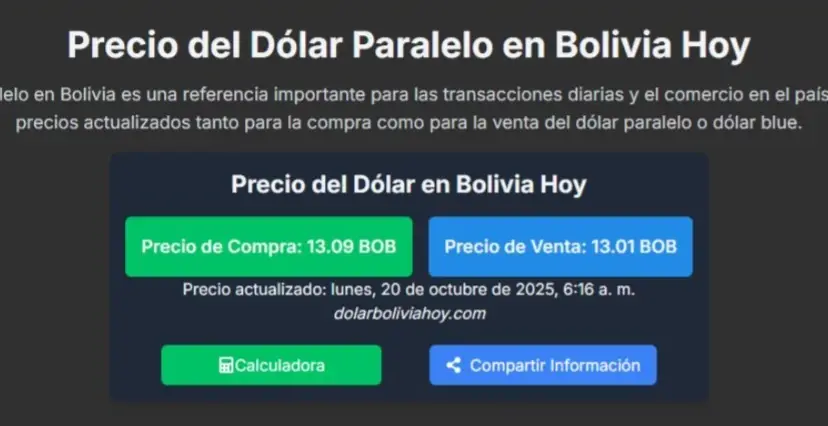 Según datos emitidos este lunes 20 de octubre de 2025, por el portal especializado dolarboliviahoy.com, la divisa estadounidense se cotiza en el mercado paralelo con un precio a la venta de 13.01 (BOB), y un precio de compra de 13.09 BOB.