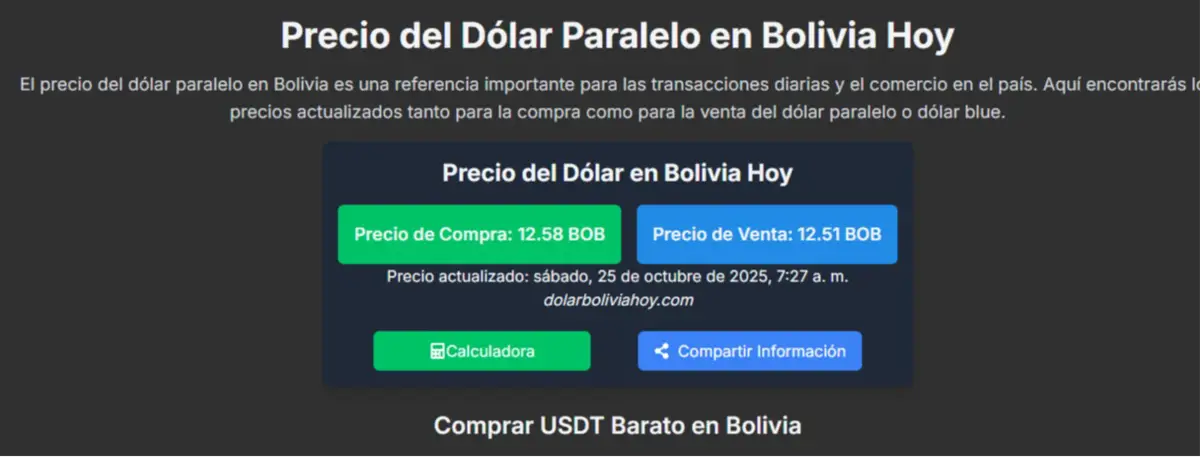 Según datos emitidos este sábado 25 de octubre de 2025, por el portal especializado dolarboliviahoy.com, la divisa estadounidense se cotiza en el mercado paralelo con un precio a la venta de 12.51 (BOB), y un precio de compra de 12.58 BOB.