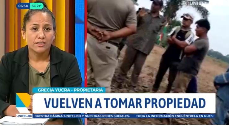 La propietaria del predio avasallado en Guarayos, Grecia Yucra, aseguró que se trata de un terreno productivo de soya que es titulado y que sufre un avasallamiento por cuarta vez