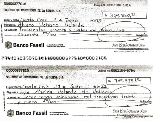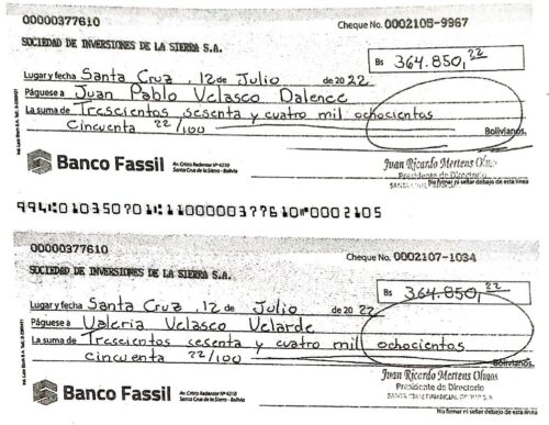 Al final del debate presentó cuatro cheques que prueban que Velasco y su familia cobraron más de un millón de bolivianos por su participación accionaria en Sociedad de Inversiones de la Sierra SA.