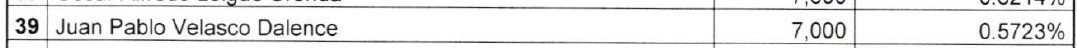 En esa nómina, el accionista 39 de la lista es Juan Pablo Velasco Dalence, con 7.000 acciones y un porcentaje de participación del 0.5723%, según la documentación presentada por el Partido Demócrata Cristiano.