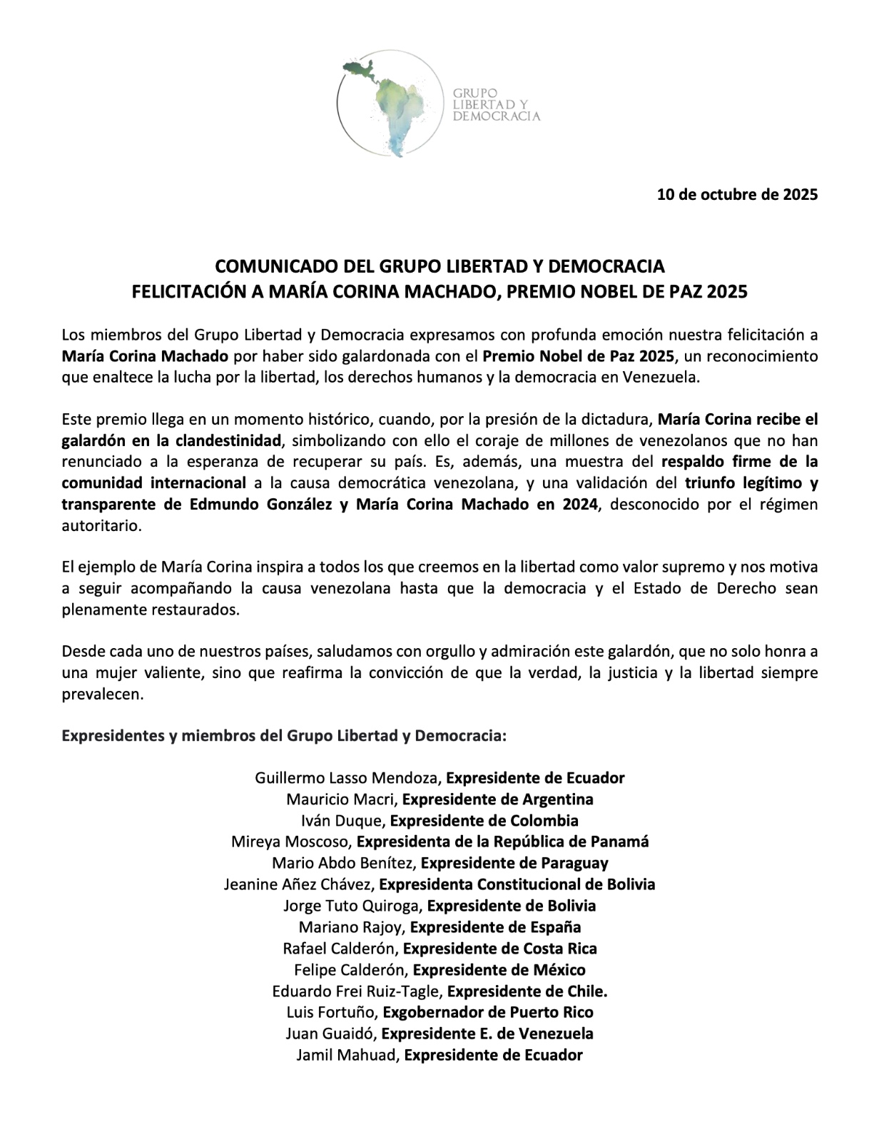 El comunicado del Grupo Libertad y Democracia concluye con un mensaje de respaldo a la lucha del pueblo venezolano: “Desde cada uno de nuestros países, saludamos con orgullo y admiración este galardón, que no solo honra a una mujer valiente, sino que reafirma la convicción de que la verdad, la justicia y la libertad siempre prevalecen”.