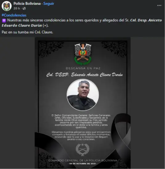 La Policía Boliviana, a través de sus redes sociales, expresó su pesar por el deceso del exjefe policial.