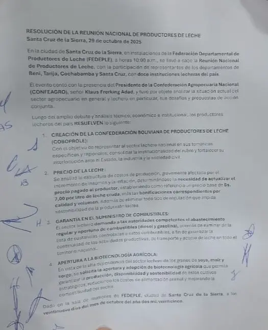 “Se analizó la estructura de costos de producción, gravemente afectadas por el incremento de los insumos y la inflación, determinándose la necesidad de actualizar el precio pagado al productor, estableciendo como referencia un precio de Bs 7 por litro de leche cruda, más las bonificaciones correspondientes por calidad y volumen. Además de eliminar toda regulación que impida la sostenibilidad de la producción láctea”, indica el documento firmado por los representantes lecheros.