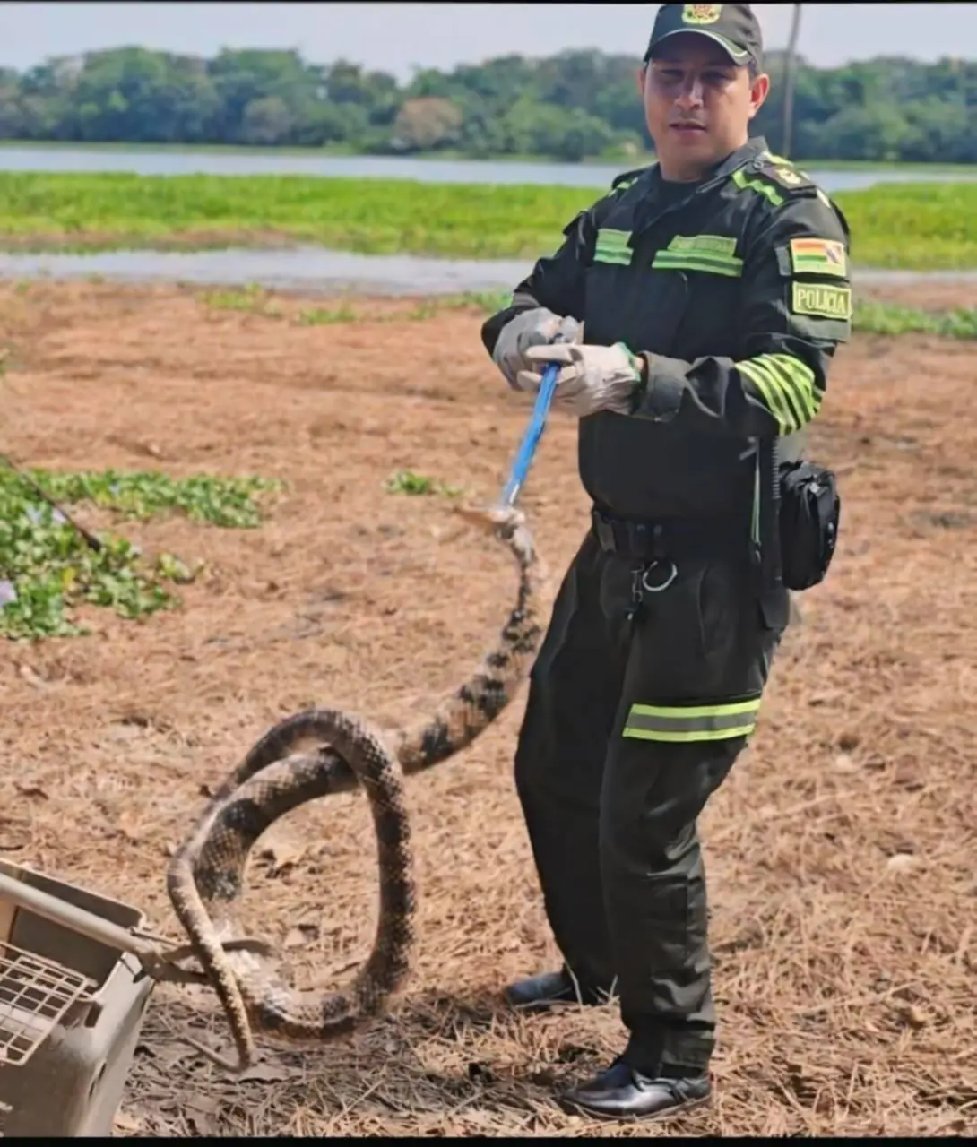 Funcionarios de la Policía Forestal y de Medio Ambiente (Pofoma) en Beni, acudieron al llamado de vecinos de la zona Arroyo Chico, quienes denunciaron la presencia de una serpiente al interior de una vivienda particular.