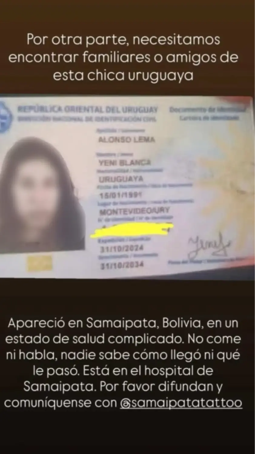 Vecinos y médicos de Samaipata, en el departamento de Santa Cruz, se encuentran conmocionados por la misteriosa aparición de Yeni, una joven uruguaya hallada desorientada y con un delicado estado de salud. La mujer, que no hablaba ni comía, fue auxiliada por pobladores que decidieron ayudarla al verla deambulando por el lugar.