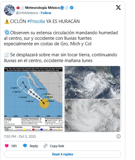 El huracán Priscilla se formó el domingo (05.10.2025) en aguas del Pacífico frente a la costa occidental de México, donde se espera que avance sin tocar tierra pero produciendo lluvias en diversos estados, reportó el Centro Nacional de Huracanes (NHC) de Estados Unidos.