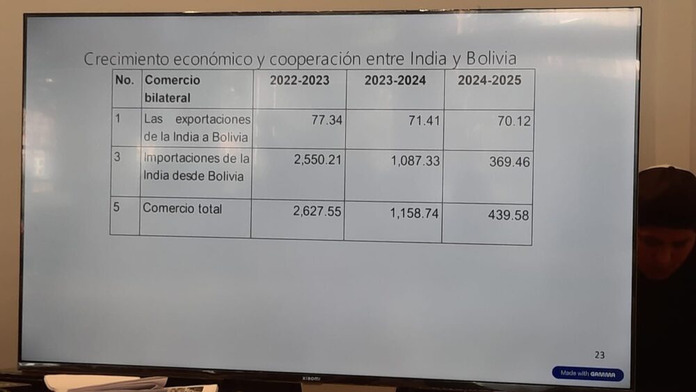 Destacó que India importa oro de Bolivia de manera significativa, hace dos años “2.300 millones de dólares de oro fueron exportados por Bolivia en 2023”, sin embargo, hizo notar que esos niveles han ido en descenso. En 2024, por algunos cambios regulatorios del Banco Central de Bolivia “se redujo a 1.000 millones de dólares y en la actualidad se ha reducido incluso a la mitad”.