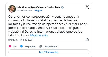«No engañan a nadie; no se trata de una guerra contra las drogas, son acciones injerencistas y violatorias de la soberanía nacional», escribió Arce en su cuenta en X.