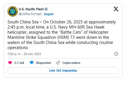 En un comunicado publicado en la red social X, la Flota del Pacífico de la Armada estadounidense confirmó que “todo el personal involucrado está a salvo y en condición estable”. La causa de ambos incidentes está bajo investigación, agregó la Armada.