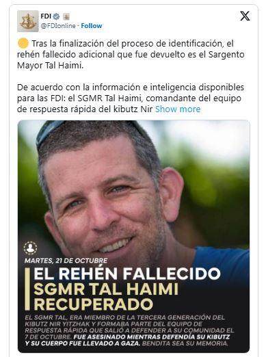 «Representantes del Ejército informaron a la familia del sargento mayor Tal Haimi de que su ser querido había sido devuelto a Israel y su identificación completada», recoge el comunicado del mandatario israelí.
