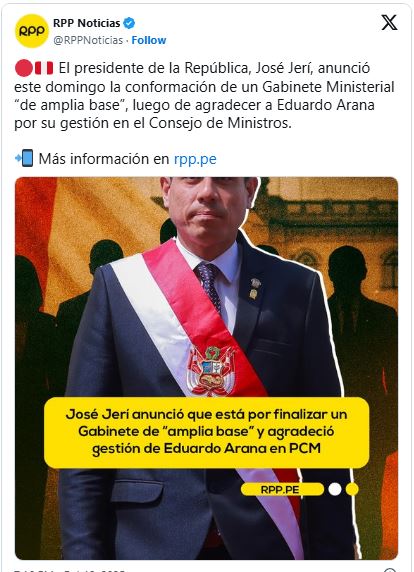 «Agradezco los servicios prestados a la nación a los integrantes del Consejo de Ministros liderado hasta hoy por Eduardo Arana. Junto al nuevo premier, finalizaremos la conformación del Gabinete de amplia base y de reconciliación nacional anunciada», señaló Jerí en su cuenta de la red social X.
