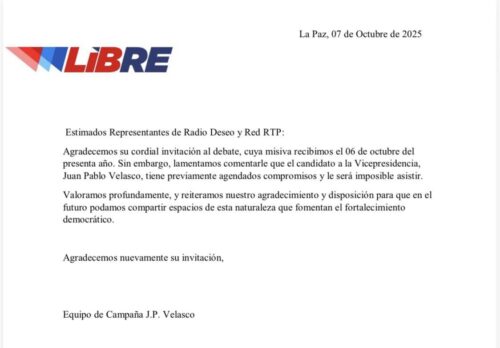 «Agradecemos su cordial invitación al debate, cuya misiva recibimos el 06 de octubre del presente año. Sin embargo, lamentamos comentarle que el candidato a la Vicepresidencia, Juan Pablo Velasco, tiene previamente agendados compromisos y le será imposible asistir», señala la carta de Libre, que fue publicada por el periodista John Arandia.