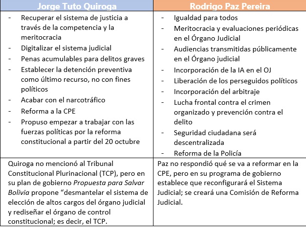 Ambos aspirantes coincidieron en presentar planes de reforma al sistema judicial, aunque con matices. Mientras que Alianza Libre de Jorge Tuto Quiroga propuso eliminar la elección popular de altos cargos judiciales (una iniciativa que podría conllevar una reforma constitucional), su discurso también incluyó posibles intervenciones más profundas al sistema institucional.