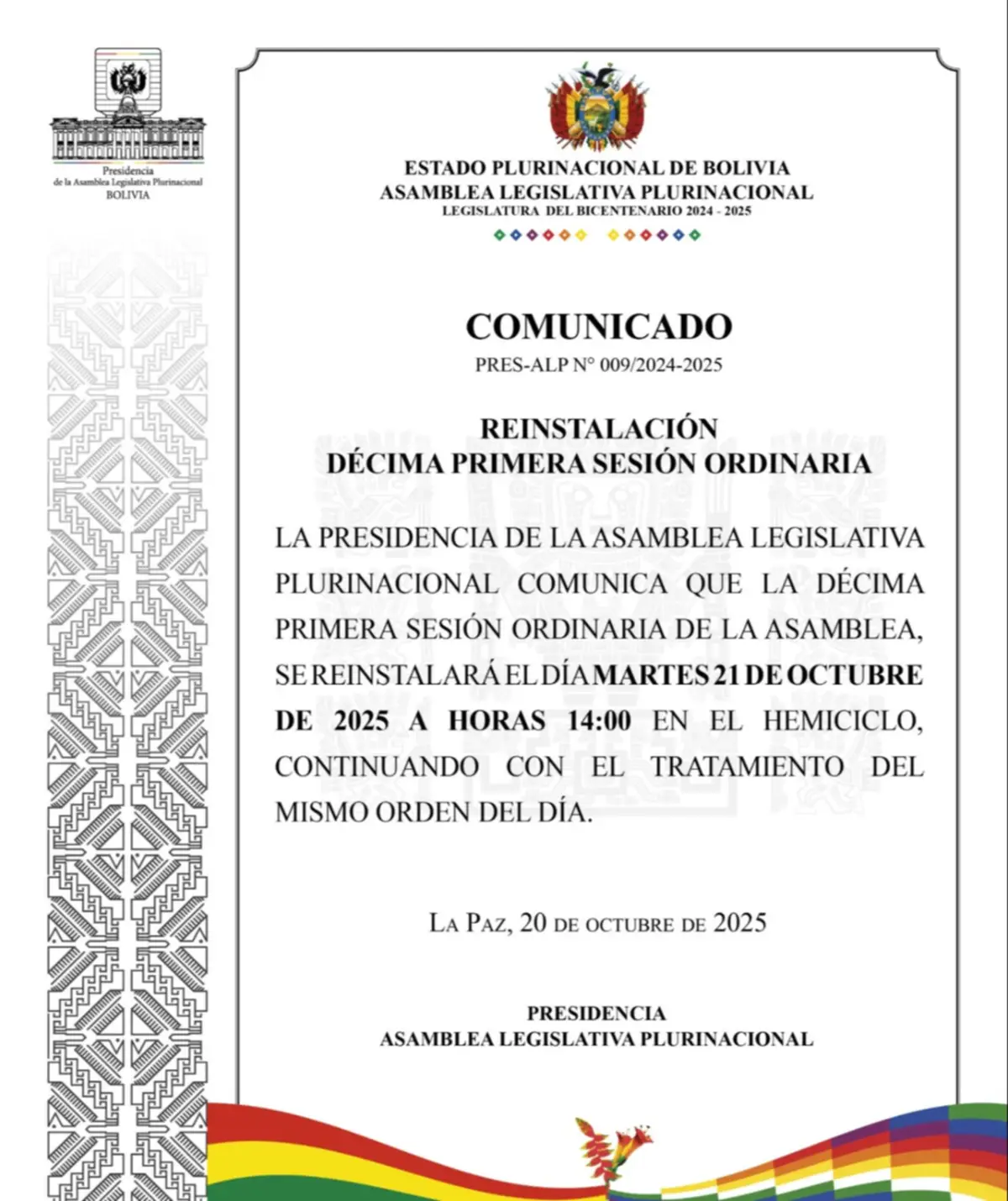 La presidencia de la Asamblea Legislativa Plurinacional (ALP) convocó para este martes 21 de octubre, a las 14:00, la reinstalación de la sesión plenaria que quedó en cuarto intermedio desde el pasado jueves 16, con el objetivo de designar al nuevo Contralor o Contralora General del Estado de una lista de 10 postulantes preseleccionados.